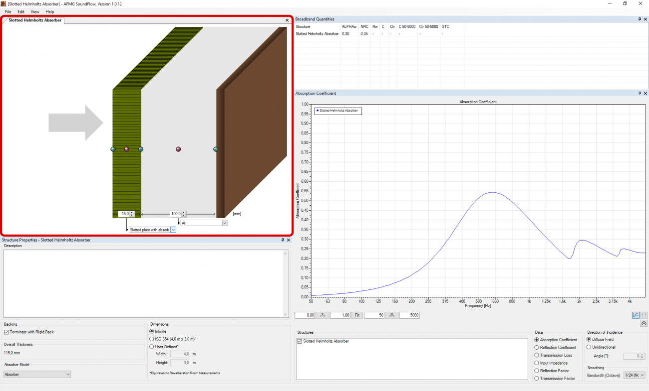 Veuillez également noter que les modèles numériques utilisés dans SoundFlow supposent que les éléments de surface sont grands par rapport à la longueur d'onde d'intérêt. Bien que SoundFlow tienne compte de certains effets de taille finie tels que l'augmentation de la surface effective due aux effets de diffraction des bords, la précision des prédictions pour les petits éléments de surface dépendra fortement des propriétés du matériau et de la forme de l'échantillon.